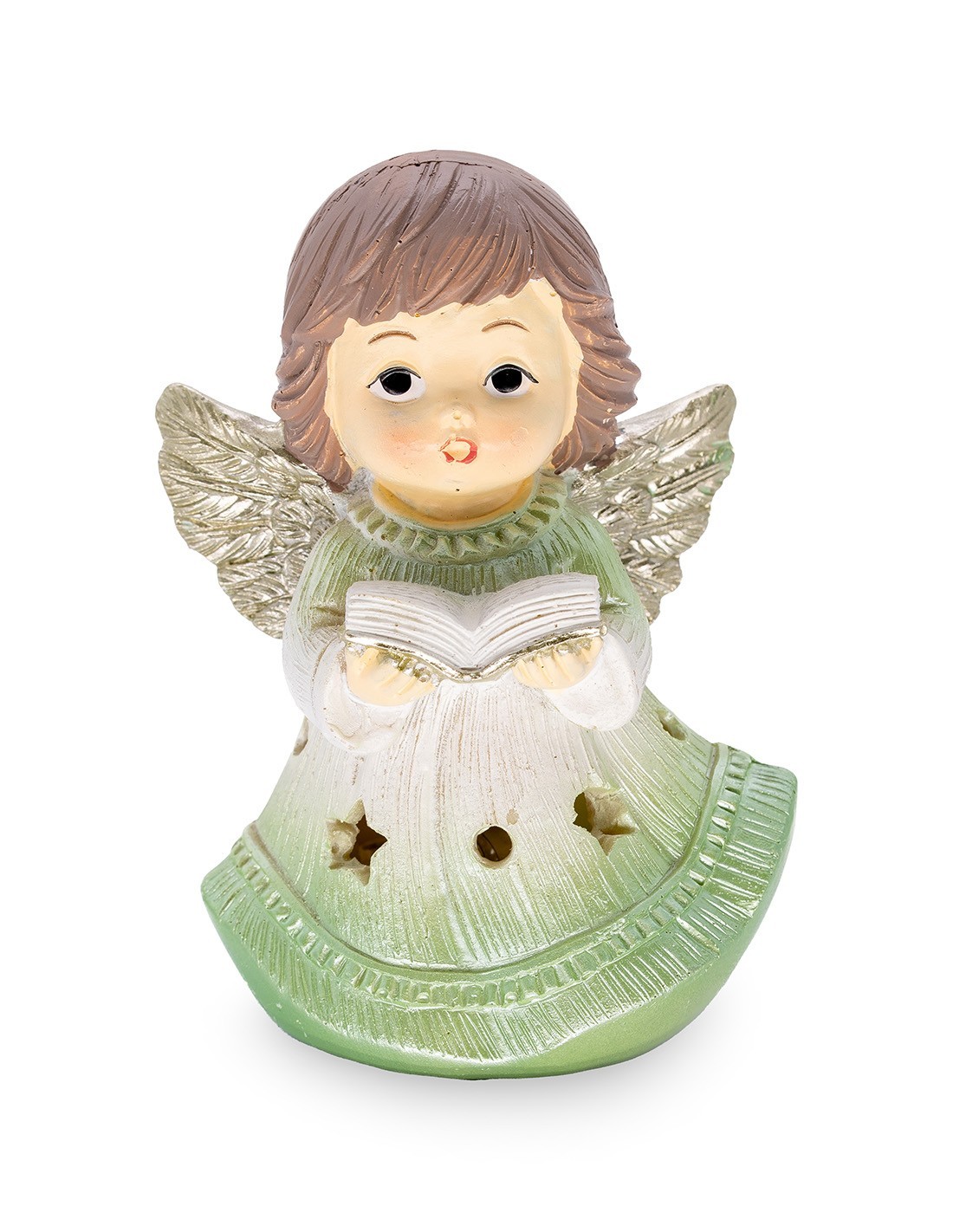 A tender Green Reading Angel Light Figurine featuring a sweet little angel in green, peacefully reading under a soft glow. A charming decorative piece that brings warmth and serenity to any space.