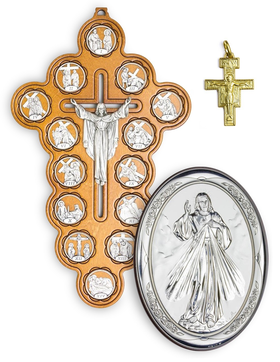 The Via Crucis recalls the centuries-old tradition of meditating on the Stations of the Cross, a practice that has shaped Lenten prayer since the Middle Ages. The Divine Mercy icon, rendered in bilaminated Sterling Silver, reflects the devotion inspired by the revelations to Saint Faustina in the 20th century, emphasizing trust and hope. The St. Damiano crucifix pendant echoes the historic cross before which Saint Francis of Assisi prayed, a powerful symbol of renewal and conversion deeply rooted in Christian heritage.