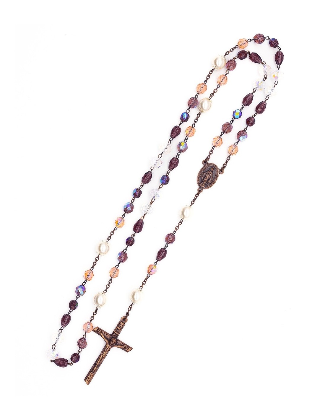 This exquisite rosary features shimmering, purple-pink Bohemian glass beads, each reflecting the light with a captivating brilliance. The centerpiece showcases a detailed Miraculous Medal, adding a touch of divine inspiration to this beautiful piece. The chain, centerpiece, and crucifix are crafted from rich bronze, complementing the vibrant hues of the beads and providing lasting durability. Made in Italy.