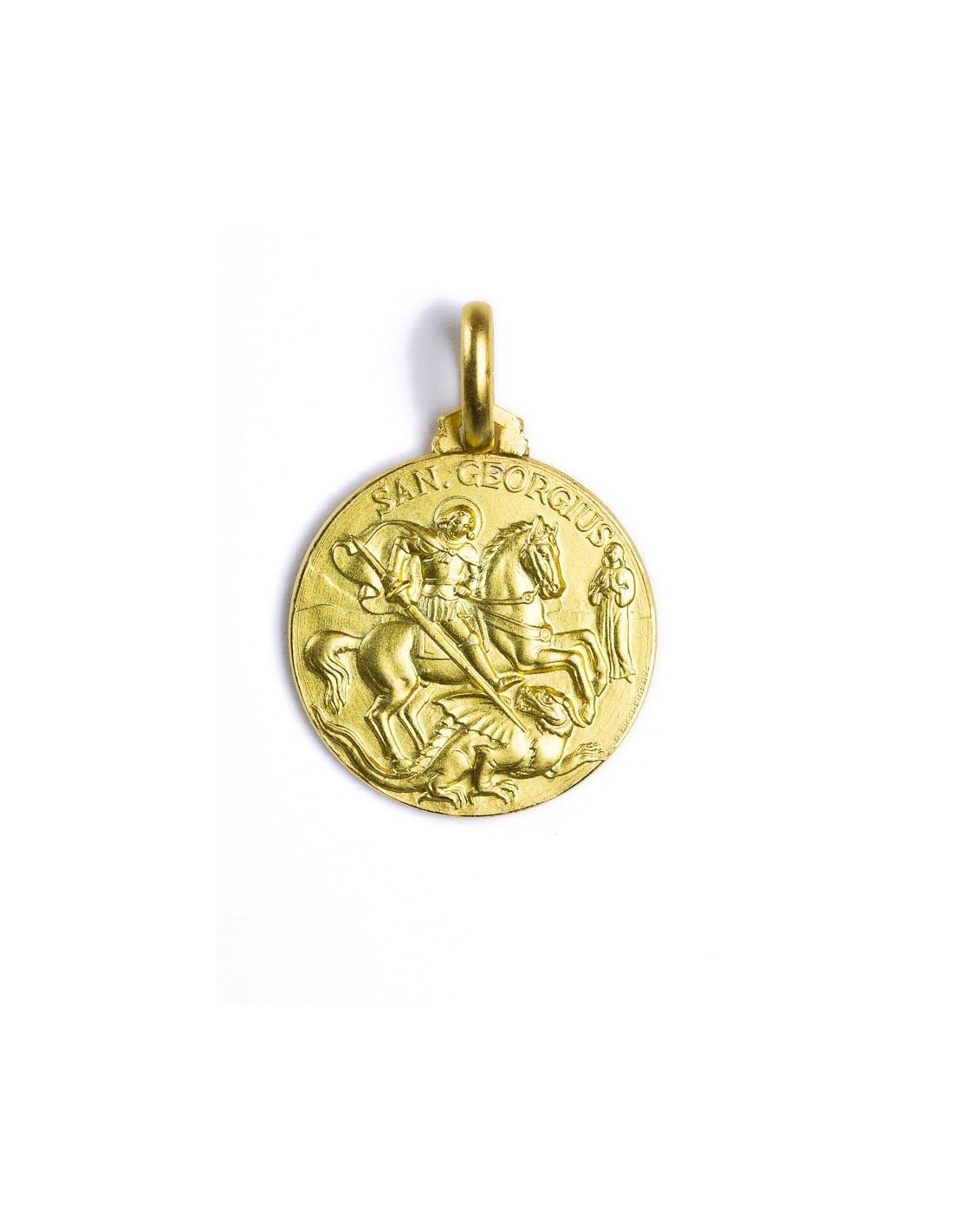 A finely struck Gold Plated St. George Medal in sterling silver, depicting the iconic image of Saint George on horseback defeating the dragon. A powerful symbol of courage, protection, and spiritual strength, enhanced by elegant 24k gold plating. Made in Florence.