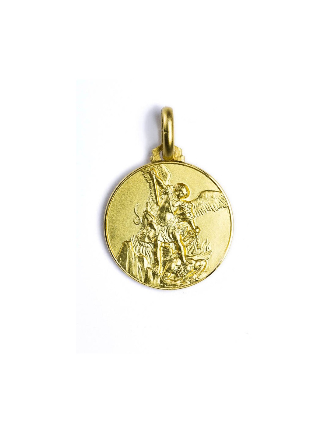A finely crafted Gold Plated St. Michael the Archangel Medal, struck in sterling silver and finished with 24k gold plating, portraying St. Michael the Archangel in his timeless role as protector and defender against evil. Made in Florence.