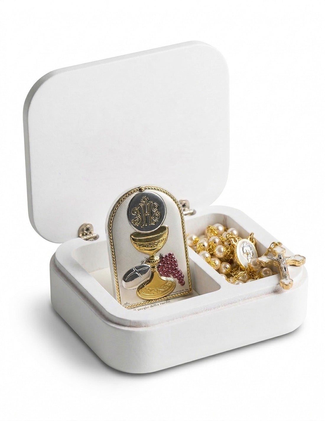 A refined First Holy Communion box set featuring a white lacquered wooden case, a bilaminate Sterling Silver plaque and icon, and a gold-tone pearl rosary, designed to honor a meaningful spiritual milestone.