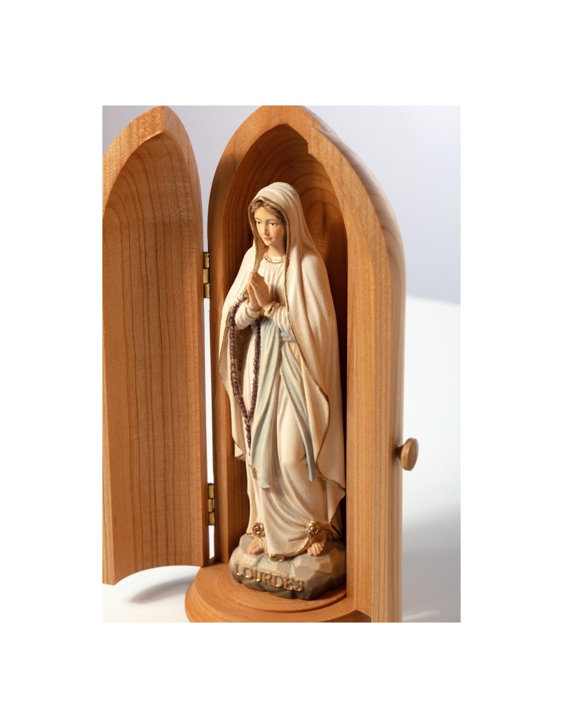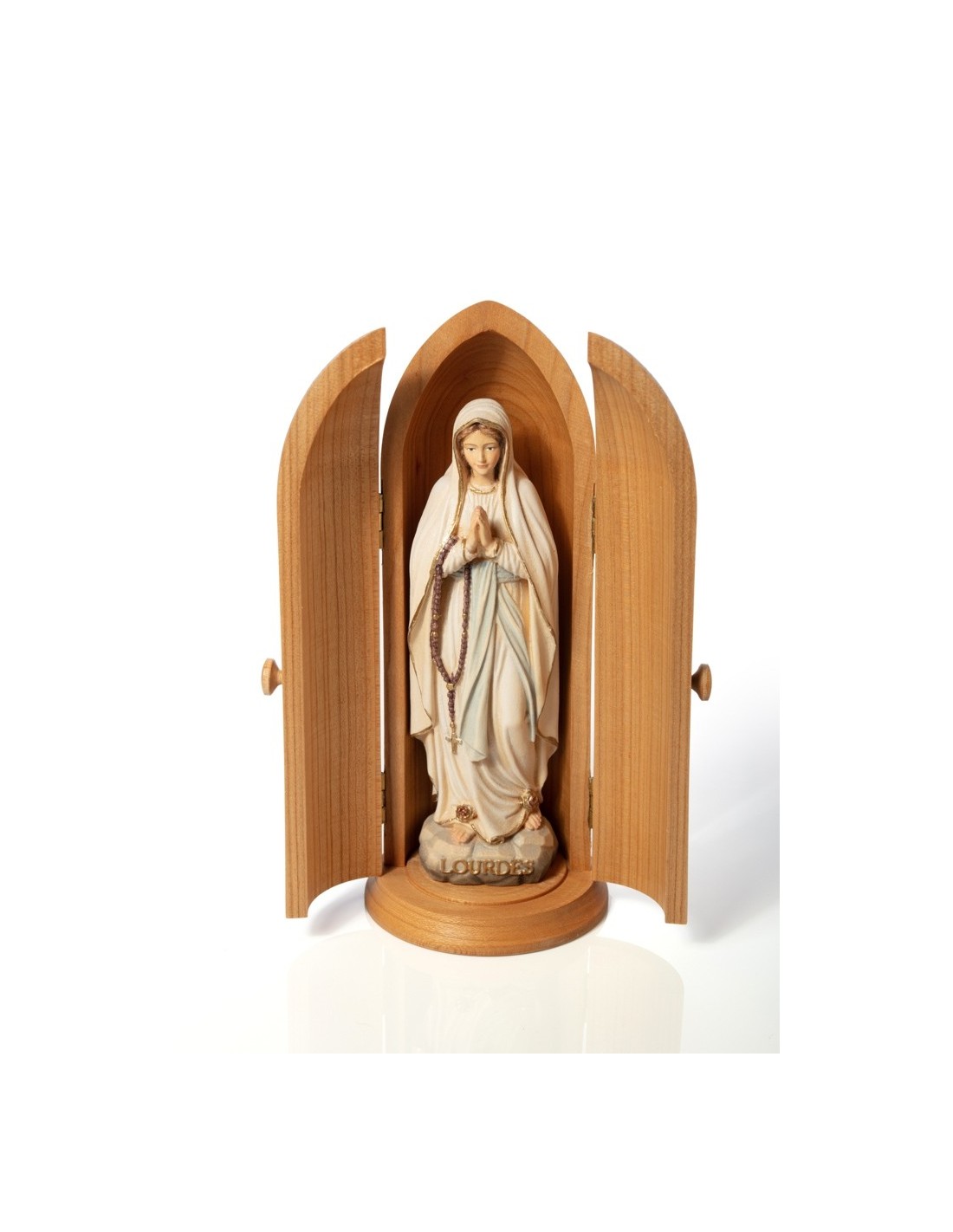 The Our Lady of Lourdes Wood Statue with Shrine is a beautifully hand-crafted devotional piece, featuring a finely detailed statue of Our Lady of Lourdes housed within an elegant wooden triptych shrine. Designed for prayer, contemplation, and home devotion, it combines spiritual meaning with timeless craftsmanship. Made in Italy.