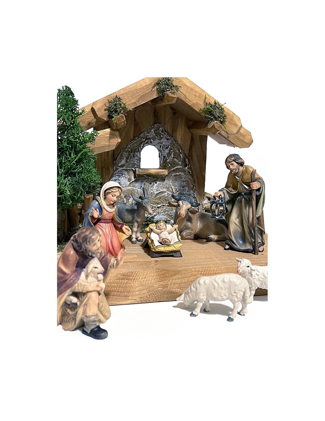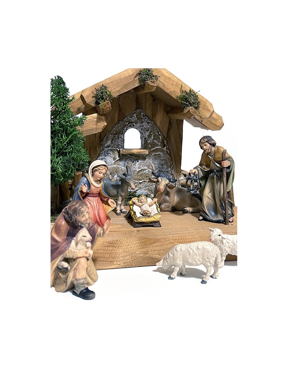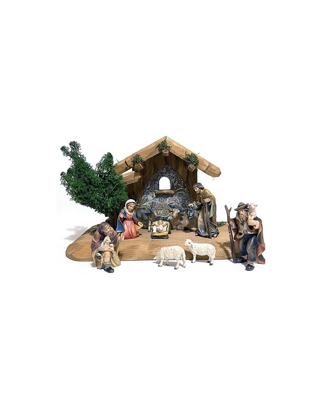 The Hand-Carved Wooden Nativity Set is a high quality 10-piece Christmas manger scene crafted from Alpine wood of Val Gardena, featuring artisan carved figurines of the Holy Family, shepherds, sheep, the ox, and the donkey, all hand-painted with care and completed by a beautifully carved stable. Made in Italy.