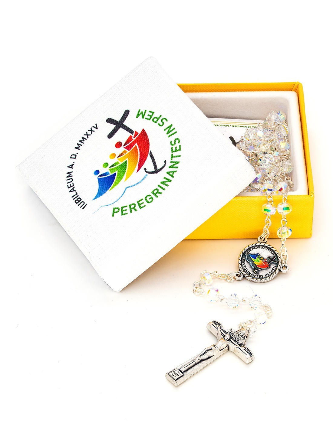 This Crystal Rosary, a tribute to the 2025 Jubilee. This exquisite rosary features crystal beads and the official Jubilee logo on the centerpiece. The unique crucifix showcases not only the image of Christ but also the iconic St. Peter's Basilica with its grand colonnade, making it a truly special and memorable piece. The rosary is presented in a coordinated paper box featuring the Jubilee 2025 logo. This Rosary is not just a tool for prayer, but also a keepsake that can be treasured for years to come, reminding you of this holy celebration and your spiritual journey. It makes a perfect gift for loved ones or a precious addition to your own collection of religious items. Made in Italy.