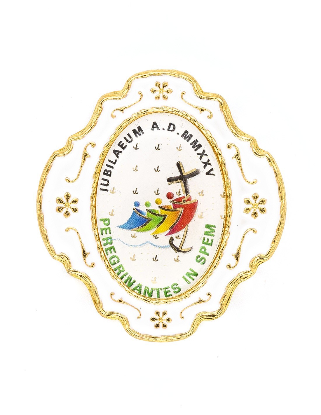 Featuring rose-shaped metal beads, gold-tone Jubilee logo medals, and a matching gold-tone crucifix, this rosary is a perfect keepsake of this special year. The rosary comes in a gold-tone metal case with a white enamel lid and the Jubilee logo printed on top. Made in Italy.