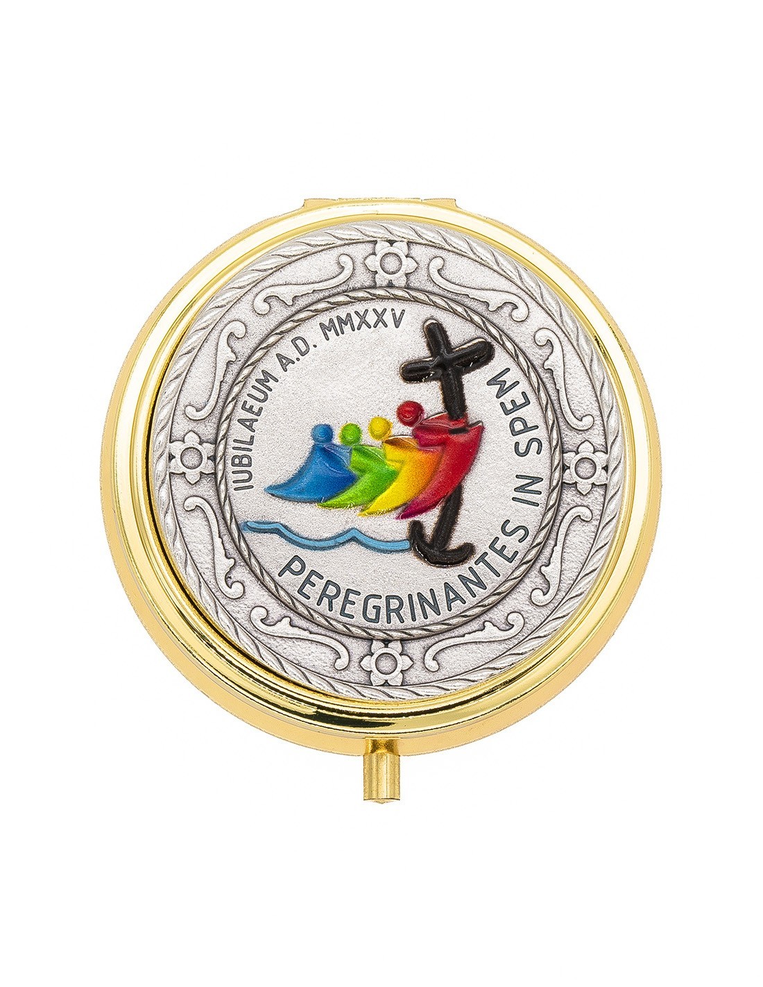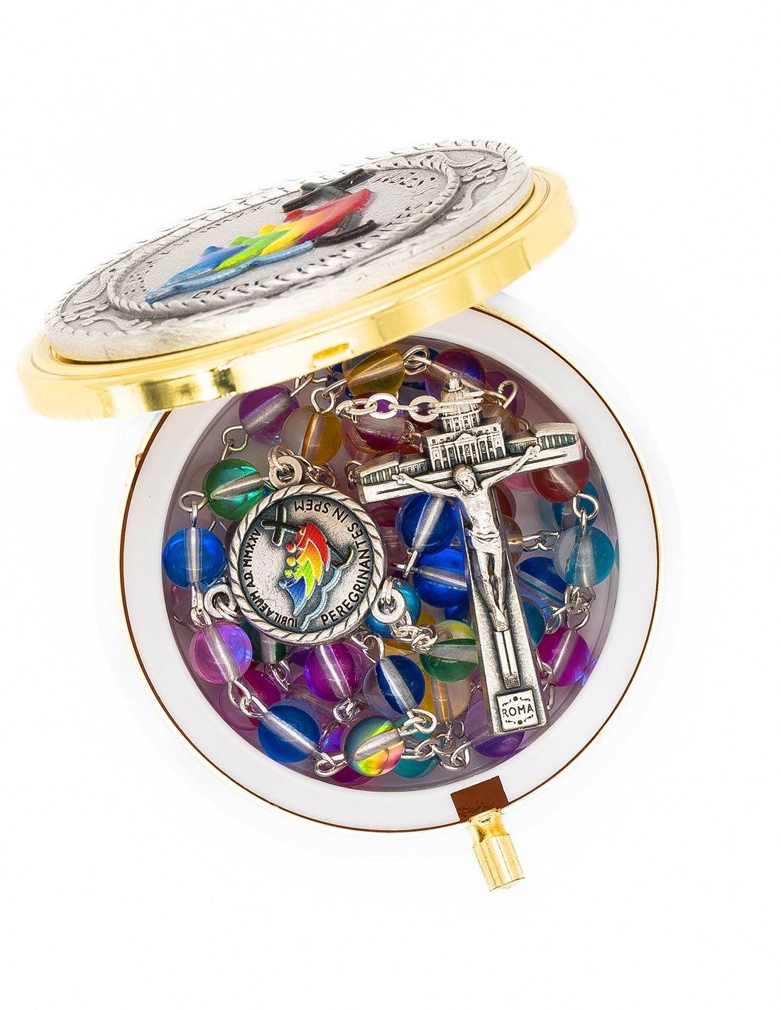 A beautiful rosary featuring colorful, glass beads and a Jubilee 2025 logo medal centerpiece. Includes a gold-colored, round metal box with a floral lid design and embossed Jubilee 2025 logo. Made in Italy.