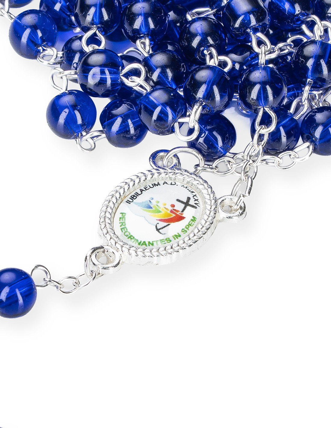 A beautiful Blue Crystal Jubilee Rosary featuring the official Jubilee 2025 logo on the centerpiece and on its presentation box, a meaningful keepsake of prayer and celebration. Made in Italy.