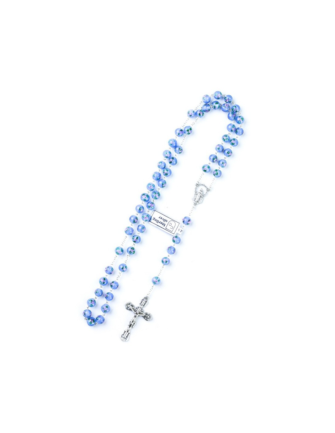 This elegant rosary features delicate baby blue Murano glass beads, each enclosing a miniature rose created with traditional Murano glass artistry, paired with sterling silver (.925) components. Made in Italy.