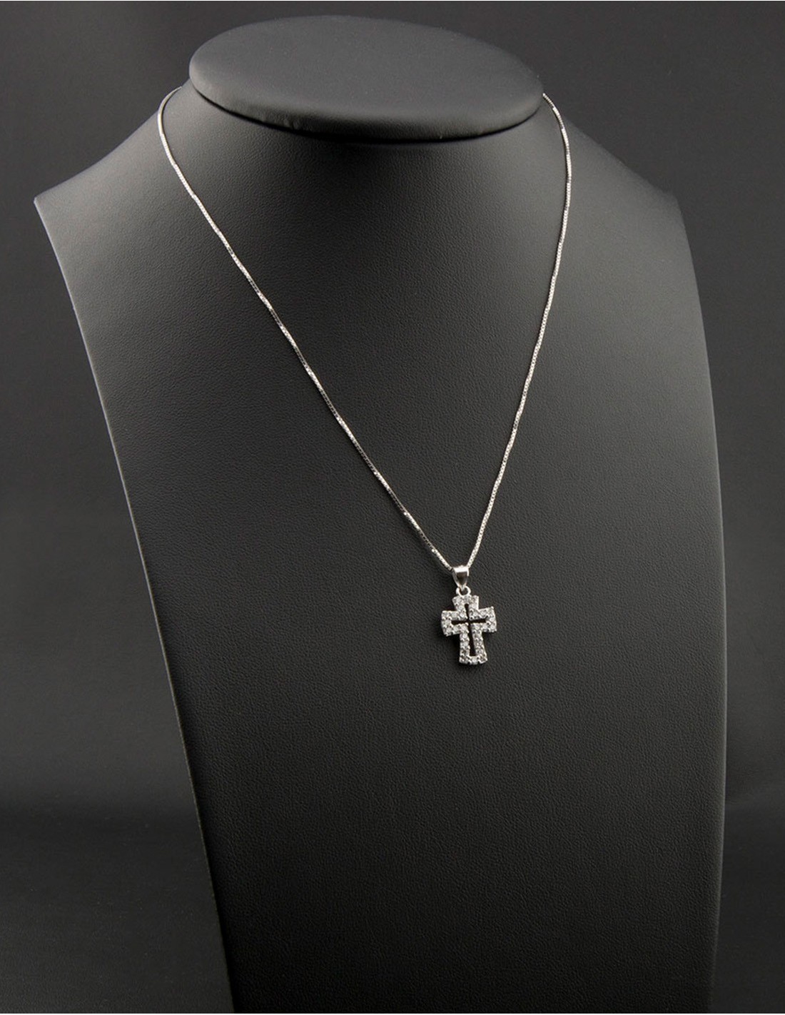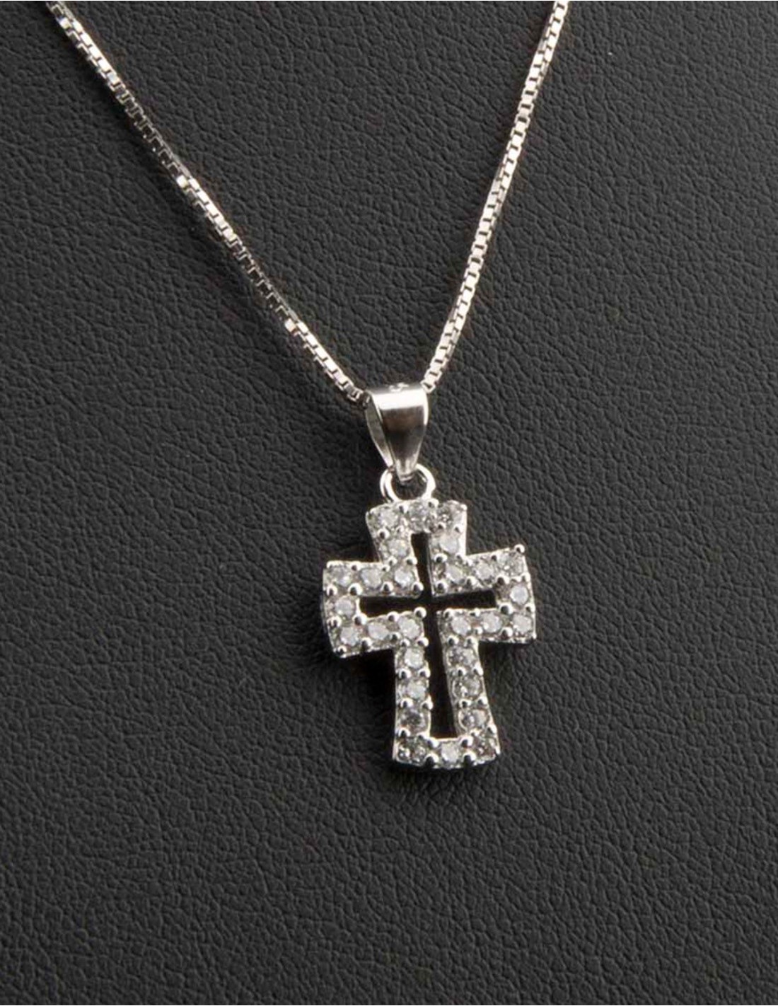 The Sterling Silver Cubic Zirconia Open Cross Pendant Necklace features a graceful open-center cross adorned with brilliant cubic zirconia stones. Crafted in Sterling Silver and paired with a matching chain, it offers a luminous and meaningful design rooted in Christian tradition. Made in Italy.
