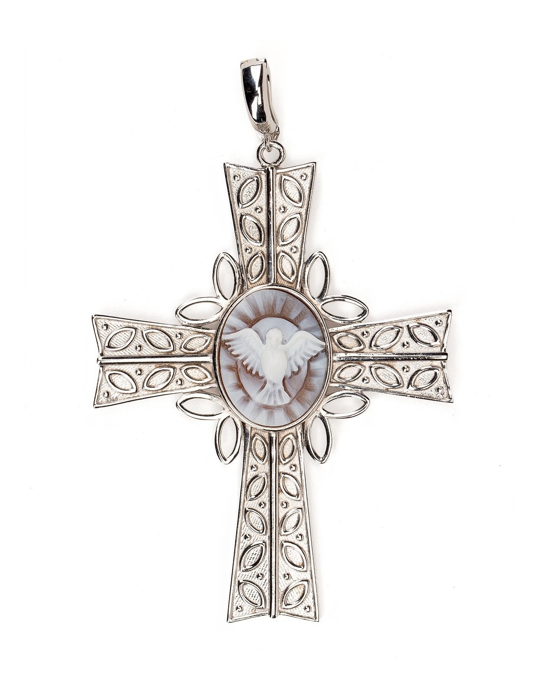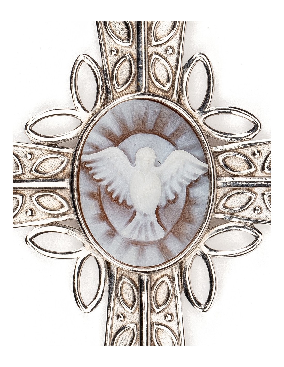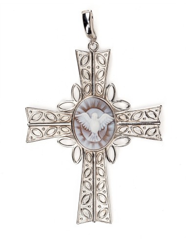 A beautifully crafted Sterling Silver cross pendant centered by a finely hand-carved Holy Spirit cameo. The refined silver surface enhances the cameo’s delicate engraving, creating a bright, timeless piece of elegance and meaning. Made in Italy.