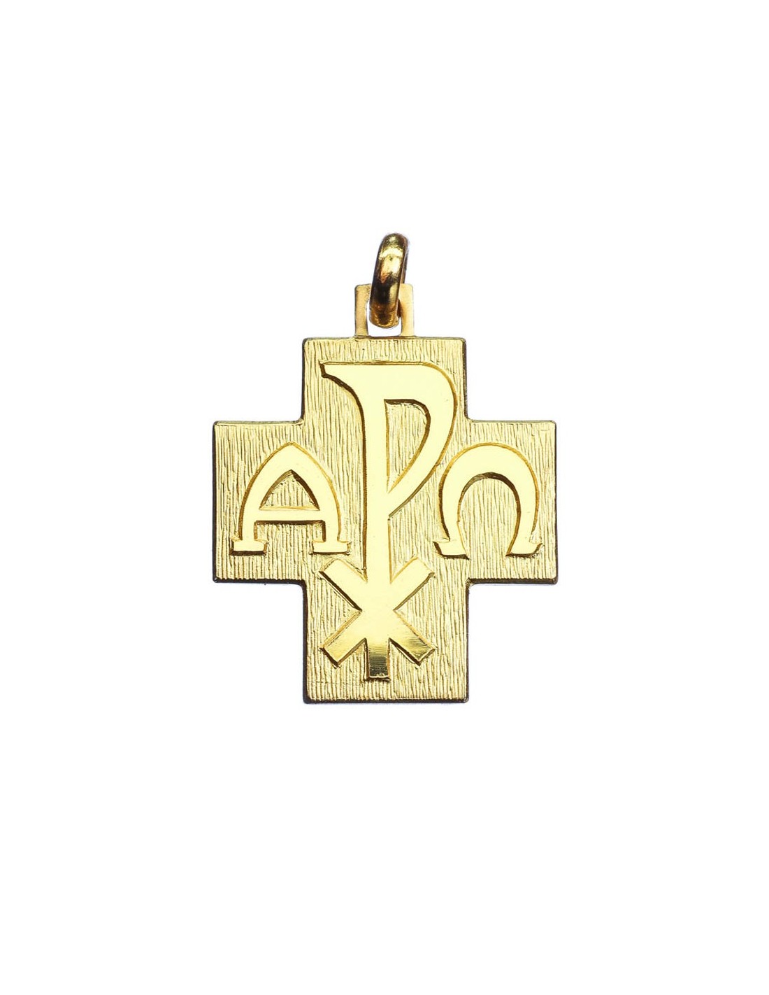 Refined gold plated cross pendant in sterling silver featuring the Alpha and Omega symbols, radiating timeless elegance and deep spiritual meaning for daily devotion or special occasions. Made in Florence.