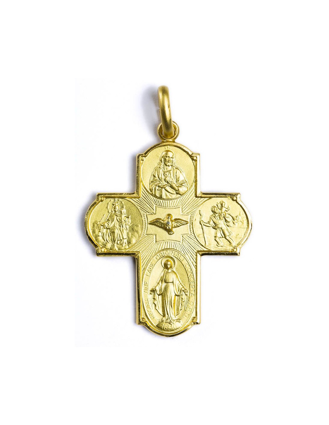 Refined Four Way Cross in Gold Plated Sterling Silver with Sacred Heart, St. Joseph, St. Christopher, and Miraculous Medal. A radiant pendant that blends elegance and devotion, perfect for special occasions and daily inspiration. Made in Italy.