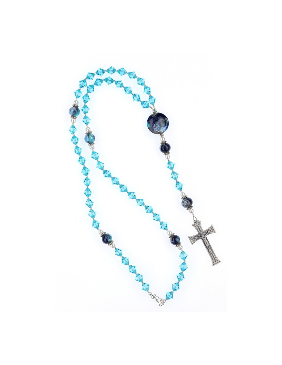 Rosary in Deep Sky Blue Crystal. The Trinity Paters are in Venetian Glss.
