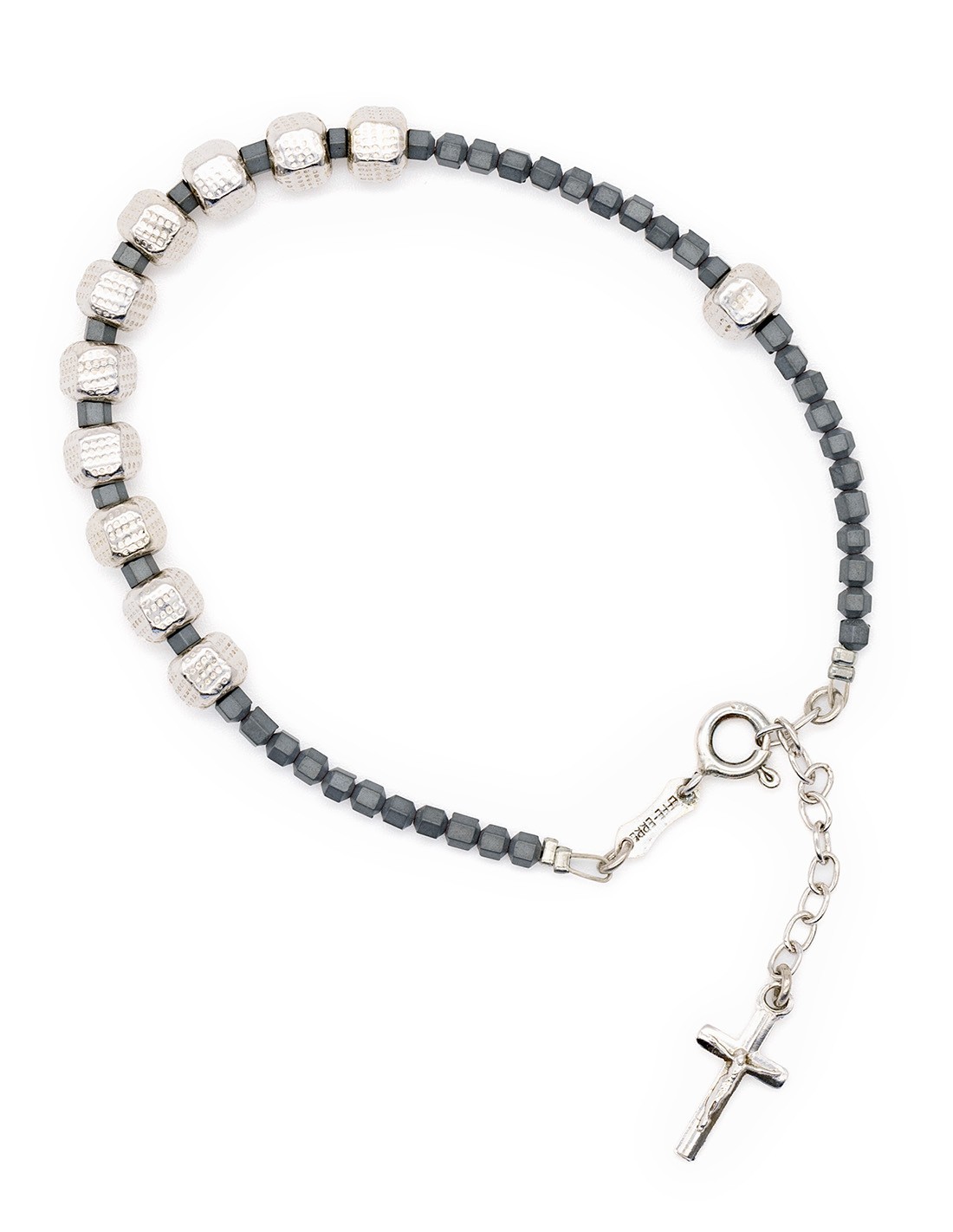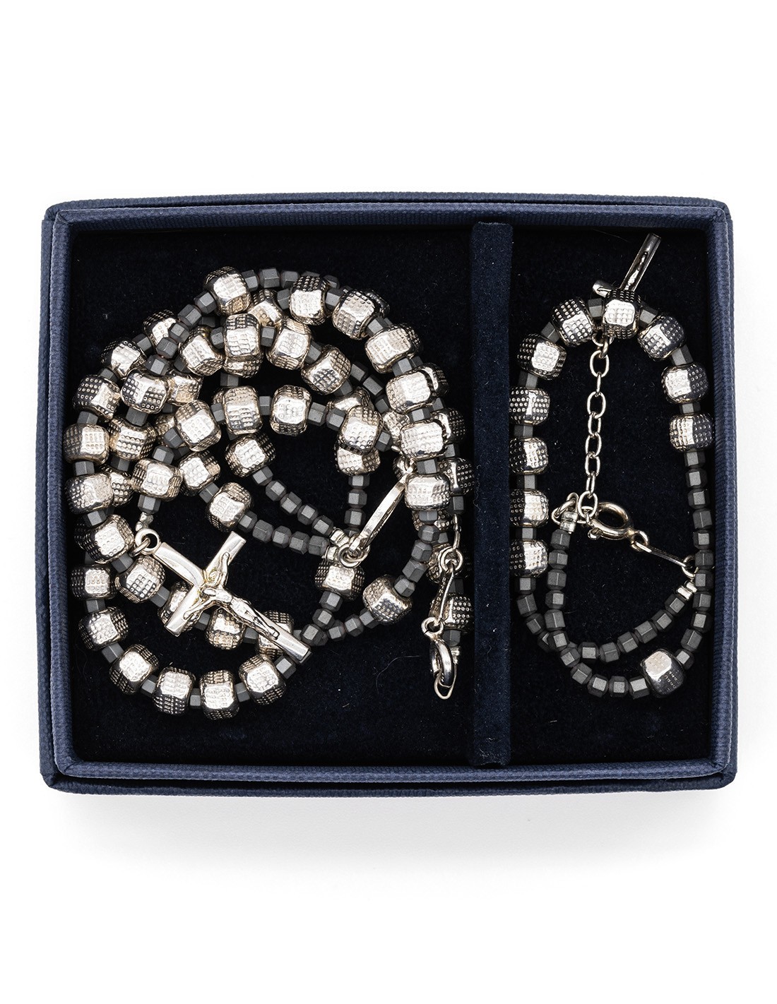This rosary necklace and bracelet set features sterling silver beads with hexagonal shape. The set also includes a sterling silver center and crucifix. The hexagonal beads are complemented by small hematite beads. Made in Italy.