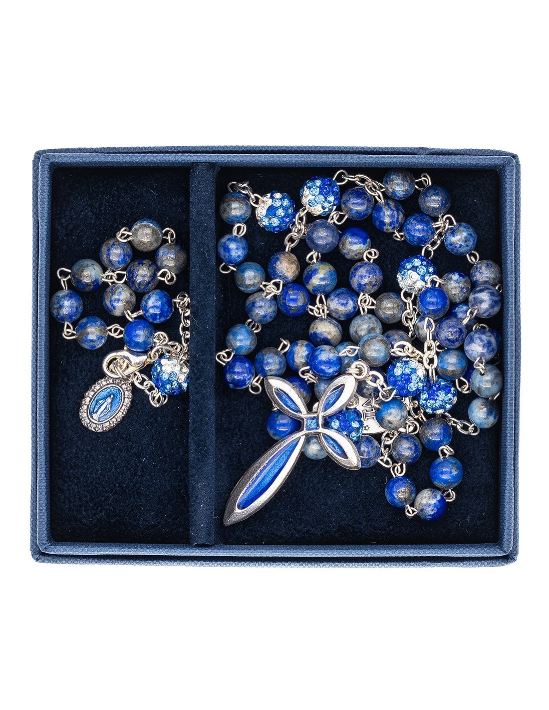 This elegant rosary and bracelet set features lapis lazuli beads, accented with sparkling crystal Our Father beads and a modern blue enamel crucifix.