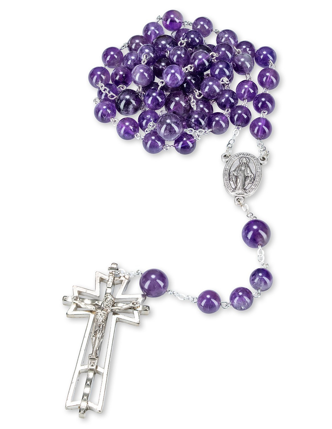 The Dark Purple Amethyst Rosary combines classic beauty with deep spiritual meaning. Each bead is made from genuine amethyst in a rich purple shade, polished to a smooth finish for a comfortable feel during prayer. Its refined design reflects a sense of reverence and simplicity that honors the sacred tradition of the Holy Rosary.