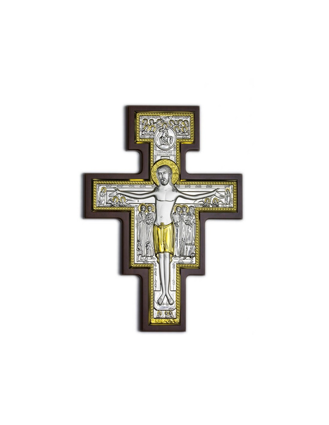 A refined Sterling Silver bilaminate San Damiano Crucifix Gold Details, accented with warm gilded touches for added depth and elegance. An inspiring centerpiece for prayer and meaningful gifting. Made in Italy.