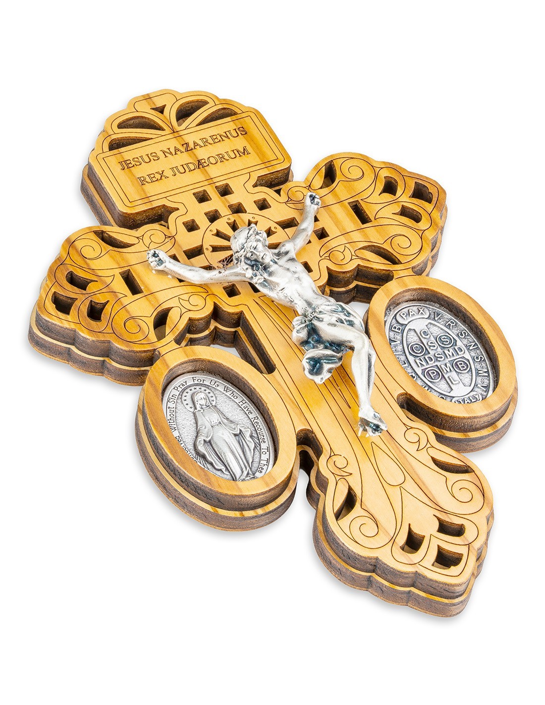 The Olive Wood Pardon Crucifix combines deep spiritual symbolism with timeless craftsmanship. Handcrafted from natural olive wood, it features a detailed metal Corpus of Christ, the Miraculous Medal and the St. Benedict Medal, symbols of protection, mercy, and redemption. Made in Italy.