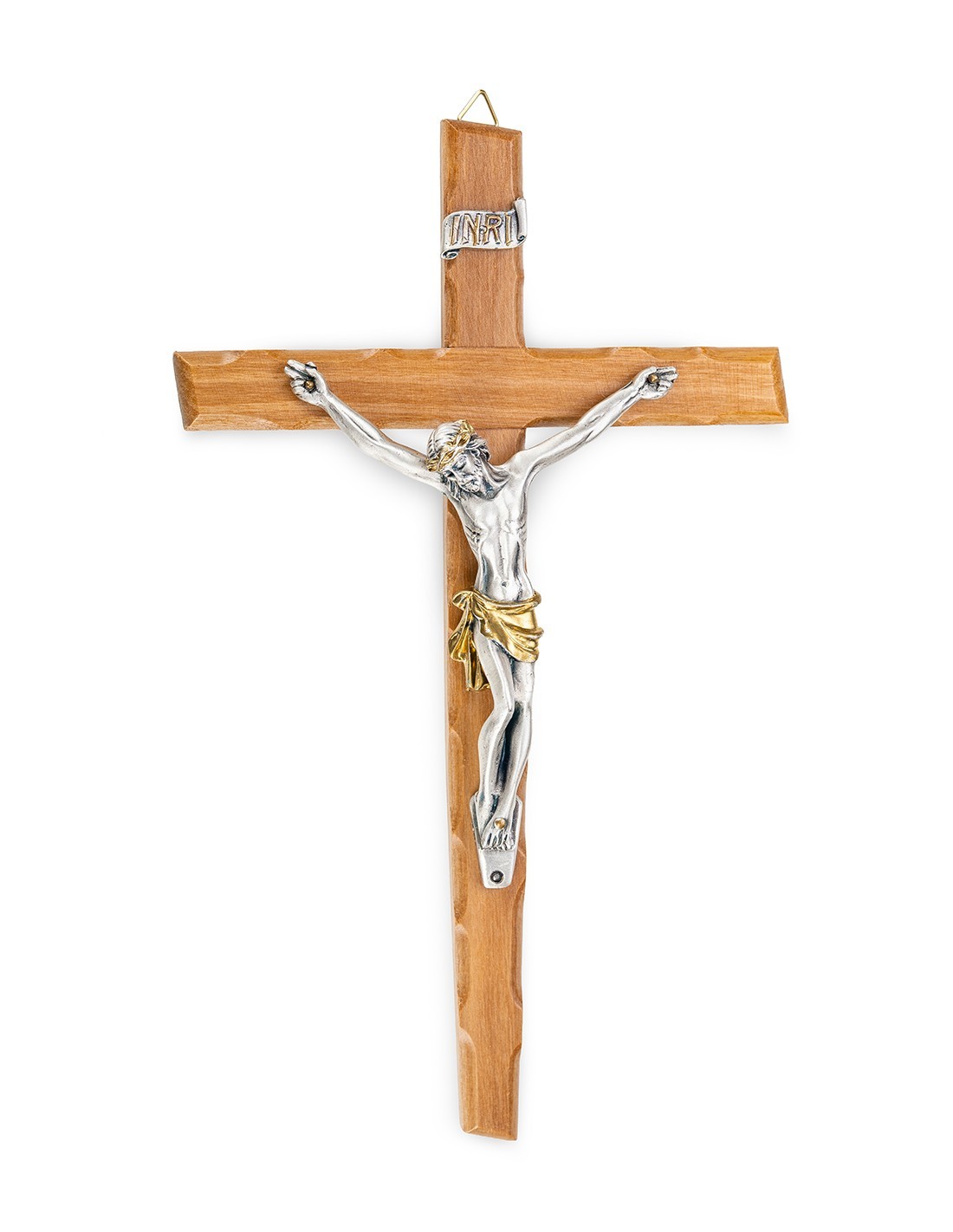 Olive Wood Crucifix Angled Routed Edges is a beautifully crafted devotional piece that combines the natural character of olive wood with the precision of finely cast metal details. The cross features a warm, golden tone with visible grain patterns, while the corpus of Christ and the INRI inscription are rendered in contrasting metal, creating a harmonious and reverent composition. The angled, routed edges give the cross a gently contoured silhouette, adding depth and visual refinement.