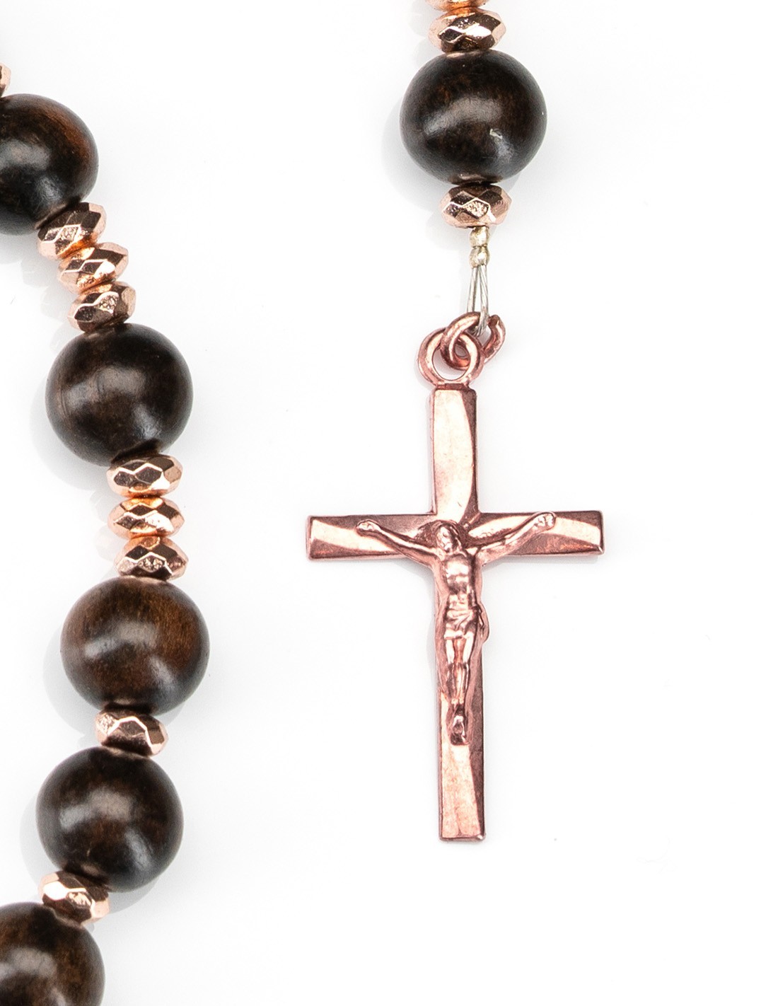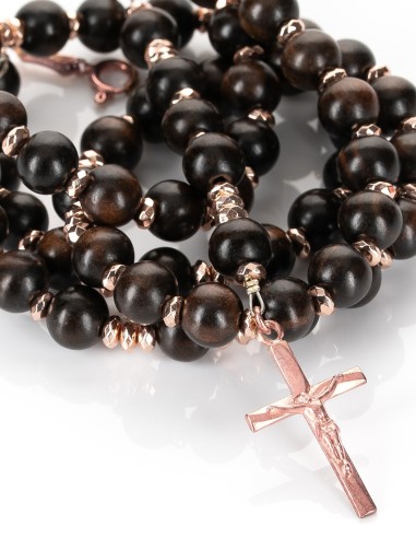 Rose Gold Plated Sterling Silver Wooden Rosary featuring smooth ebony beads, accented with genuine hematite spacers, a finely crafted crucifix, and centerpiece. A rosary combining natural warmth with lasting quality. Made in Italy.