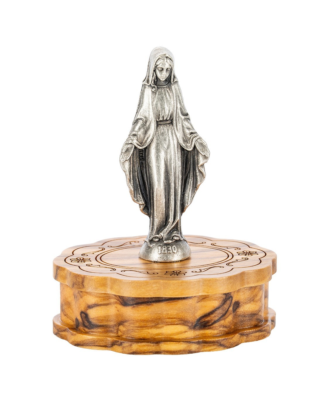 Olive Wood Rosary Our Lady of Grace Figurine Box Set Silver Tone
